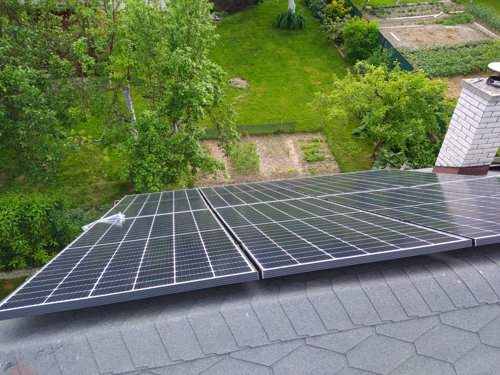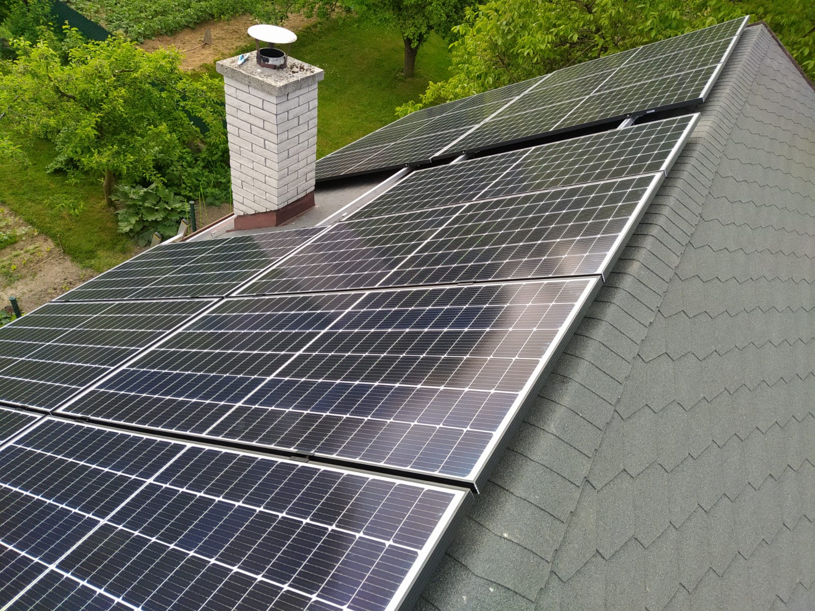 Na sedlovou střechu pokrytou šindelem jsme odborně nainstalovali 15 fotovoltaických panelů. Panely byly pečlivě upevněny s ohledem na strukturu střechy a optimální orientaci pro maximální výkon.