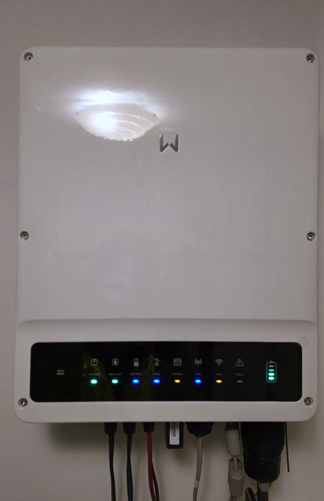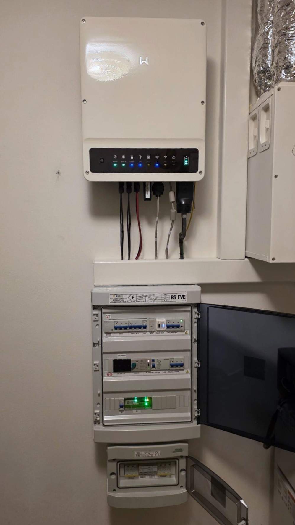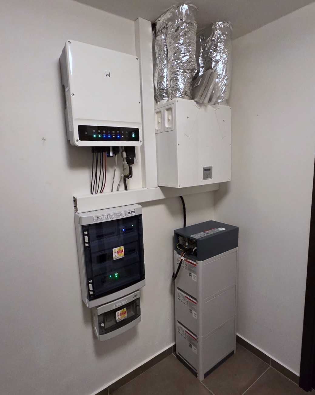 Kabeláž od solárních panelů byla vedena prostupem ze střechy do nízkého podkroví a následně dalším prostupem přímo do technické místnosti (TM). Odtud je kabeláž vedena přes stěnu do prostoru chodby domu, kde je umístěna veškerá technologie fotovoltaické elektrárny. Zvolená trasa je krátká, přehledná a minimalizuje zásahy do interiéru.