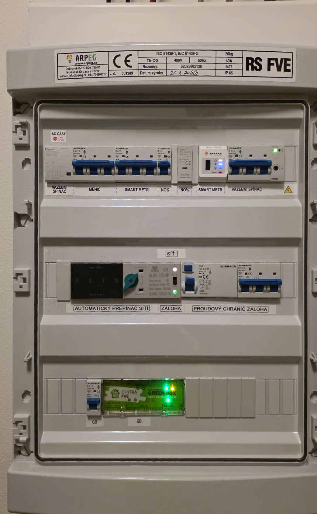 Součástí instalace je GreenBox, který zajišťuje inteligentní řízení fotovoltaické elektrárny. Systém optimalizuje tok energie mezi výrobou, bateriemi, domácností a distribuční sítí, umožňuje lepší využití vlastní elektřiny, sleduje provoz FVE v reálném čase a připravuje domácnost na budoucí možnosti, jako je spotové obchodování či další rozšiřování systému.