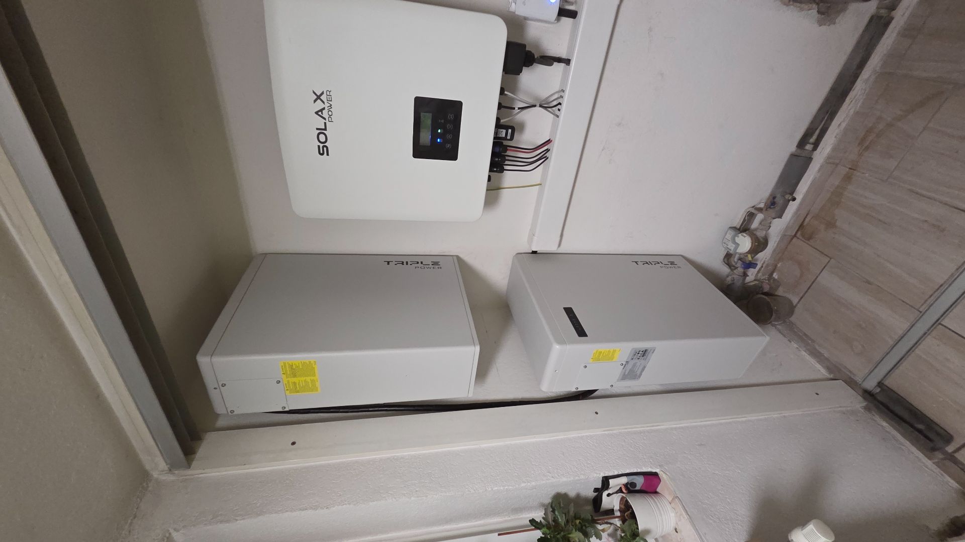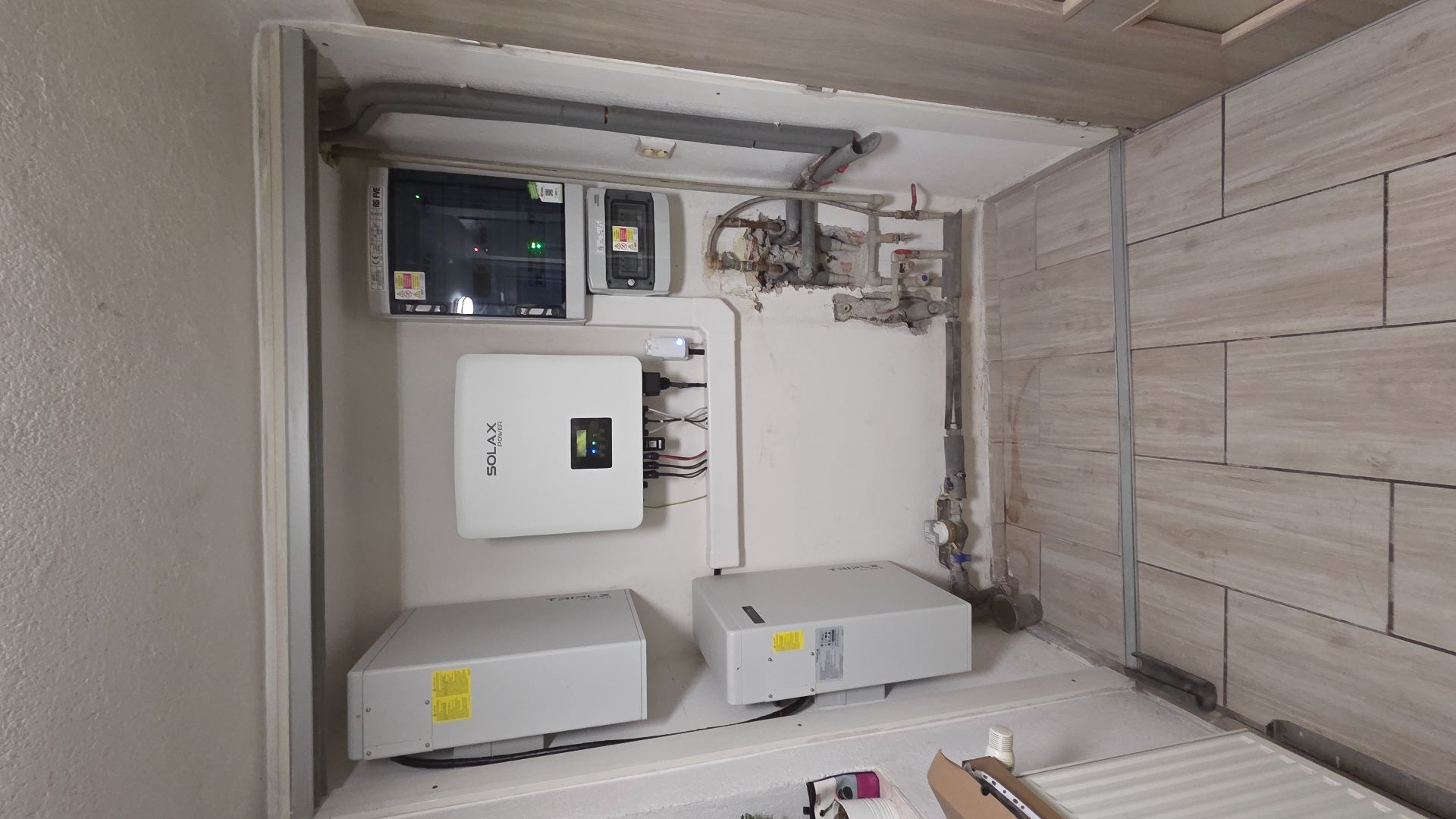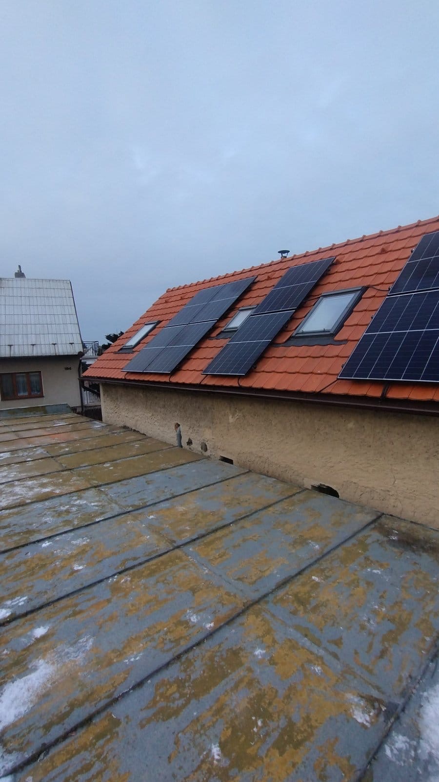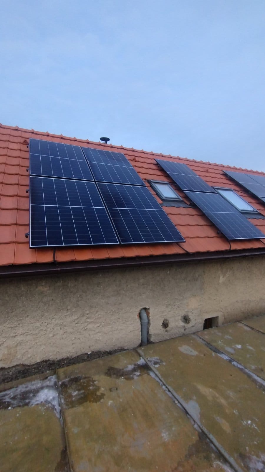 Kabeláž od solárních panelů byla vedena prostupem ze střechy do půdního prostoru a následně průrazem do předsíně, kde byla umístěna veškerá technologie fotovoltaické elektrárny.
