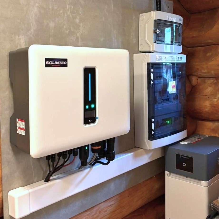 Rodinný dům je srubové konstrukce, proto jsme pro instalaci technologie použili nehořlavou desku Cetris, na kterou jsme upevnili střídač (měnič) a řídicí jednotku GreenBox. Hned vedle se nachází hlavní domovní rozvaděč (HDR), takže pro propojení nebylo nutné provádět dlouhé vedení – kabeláž jsme připojili přímo na stěně vedle rozvaděče.