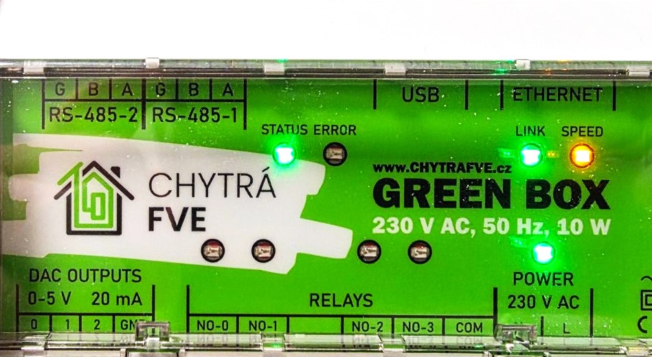 Součástí systému je jednotka GreenBox, která zajišťuje inteligentní řízení celé FVE: