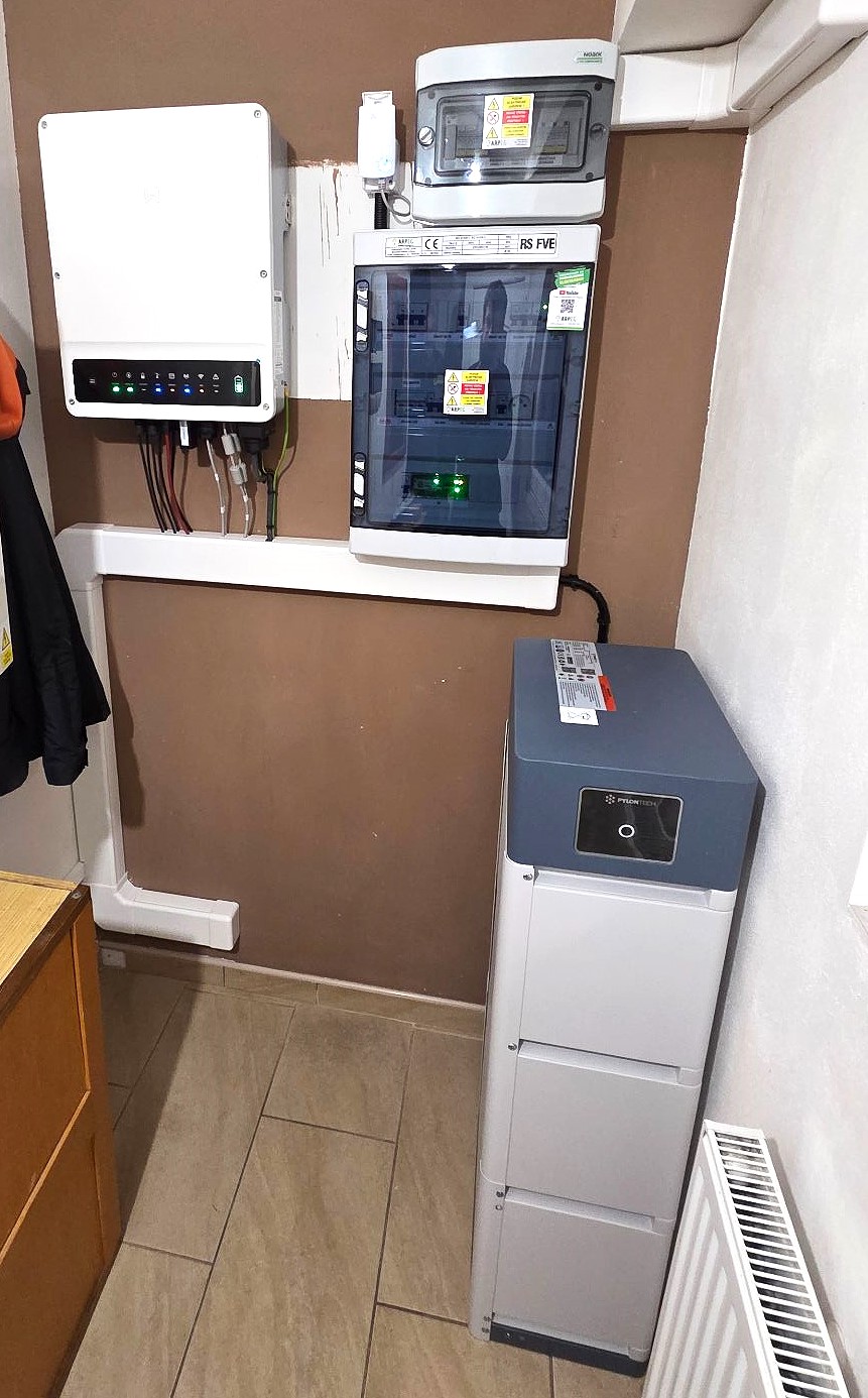 V chodbě rodinného domu, kde jsou stabilní podmínky a dostatek prostoru, jsme nainstalovali střídač GoodWe ET, bateriové úložiště Pylontech Force H2, kompletní ochranné prvky fotovoltaiky (rozvaděč FVE) a také řídicí jednotku GreenBox. Vše je umístěno přehledně na jednom místě, což výrazně zjednodušuje kontrolu, údržbu i dlouhodobý provoz celé fotovoltaické elektrárny.