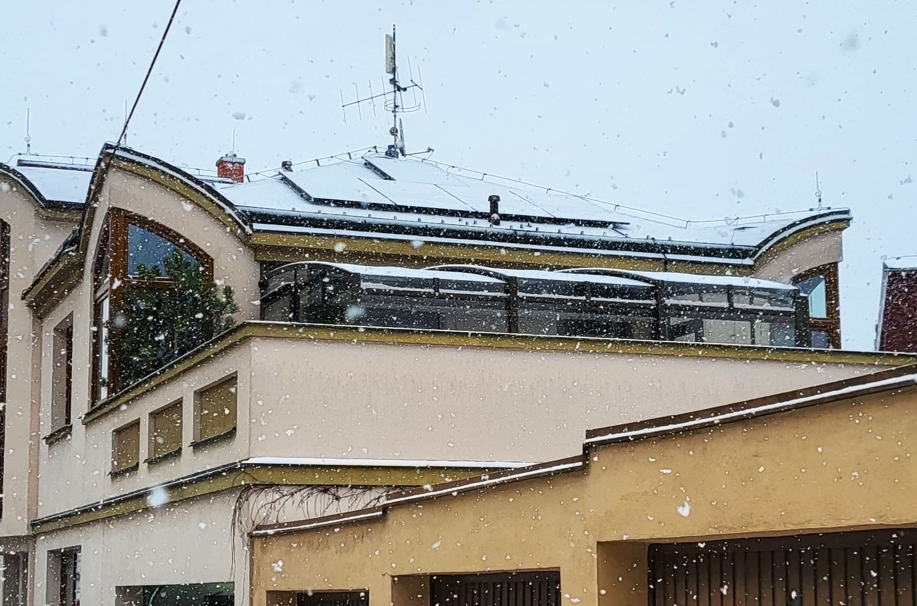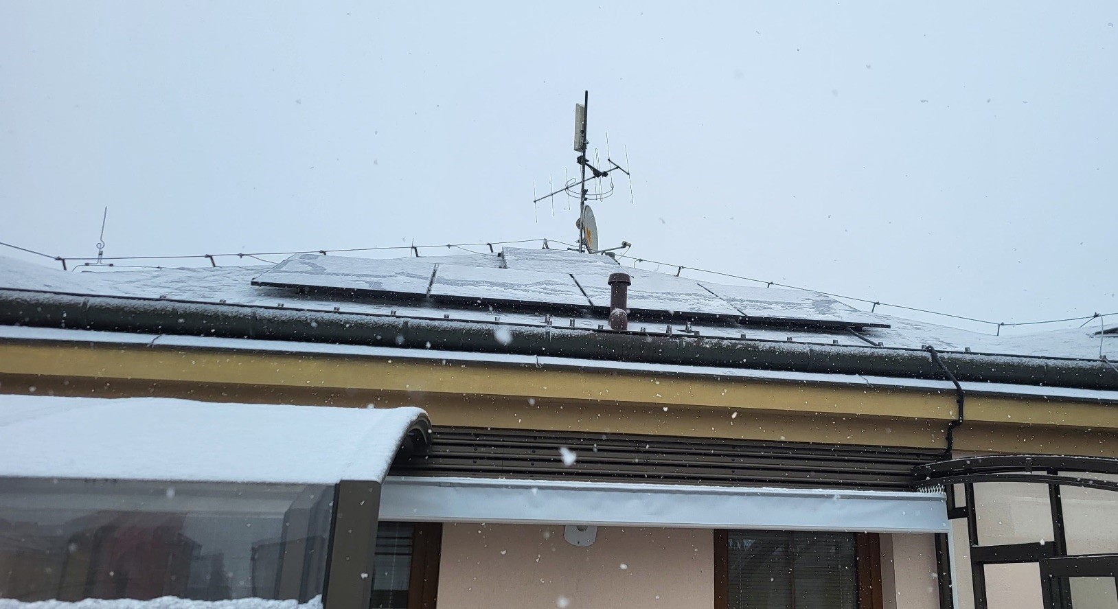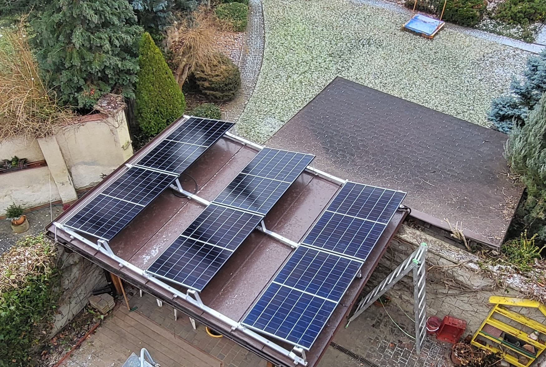 Celkem jsme instalovali 17 solárních panelů, z toho 6 panelů bylo umístěno na pergole s plechovou střechou s falcem a zbývající panely na střeše rodinného domu se šindelovou krytinou. Toto řešení umožnilo maximálně využít dostupné plochy a dosáhnout celkového výkonu 7,65 kWp, který zajišťuje dostatek elektrické energie pro běžný provoz domácnosti i nabíjení bateriového úložiště.