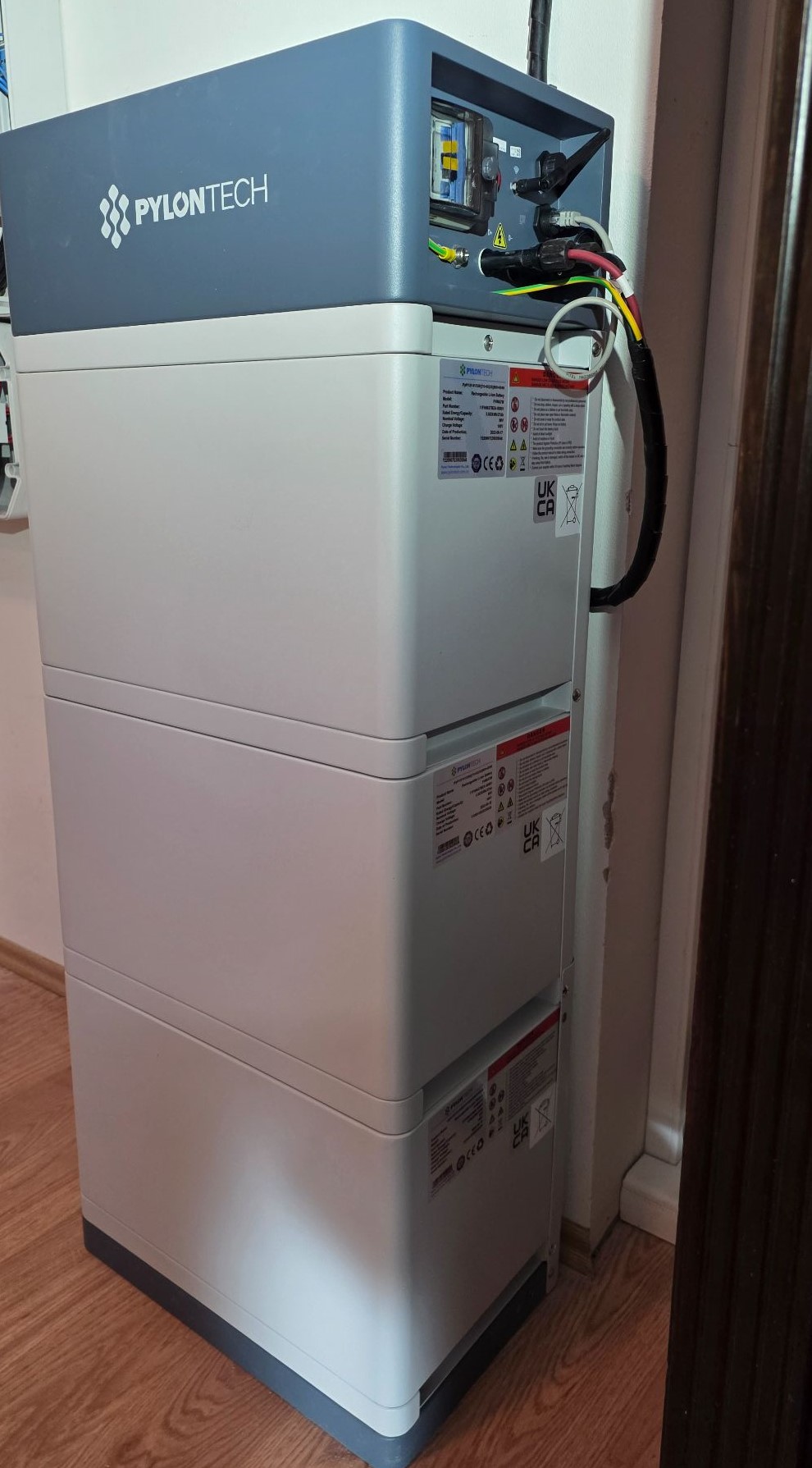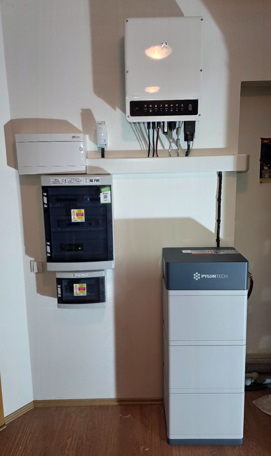 V technické místnosti jsme nainstalovali střídač GoodWe, bateriové úložiště Pylontech 10,65 kWh, ochranné prvky fotovoltaiky a také řídicí jednotku GreenBox. Veškerá technologie je umístěna na jednom místě, což zajišťuje snadnou obsluhu, přehledný monitoring a dlouhodobě spolehlivý provoz celé fotovoltaické elektrárny.