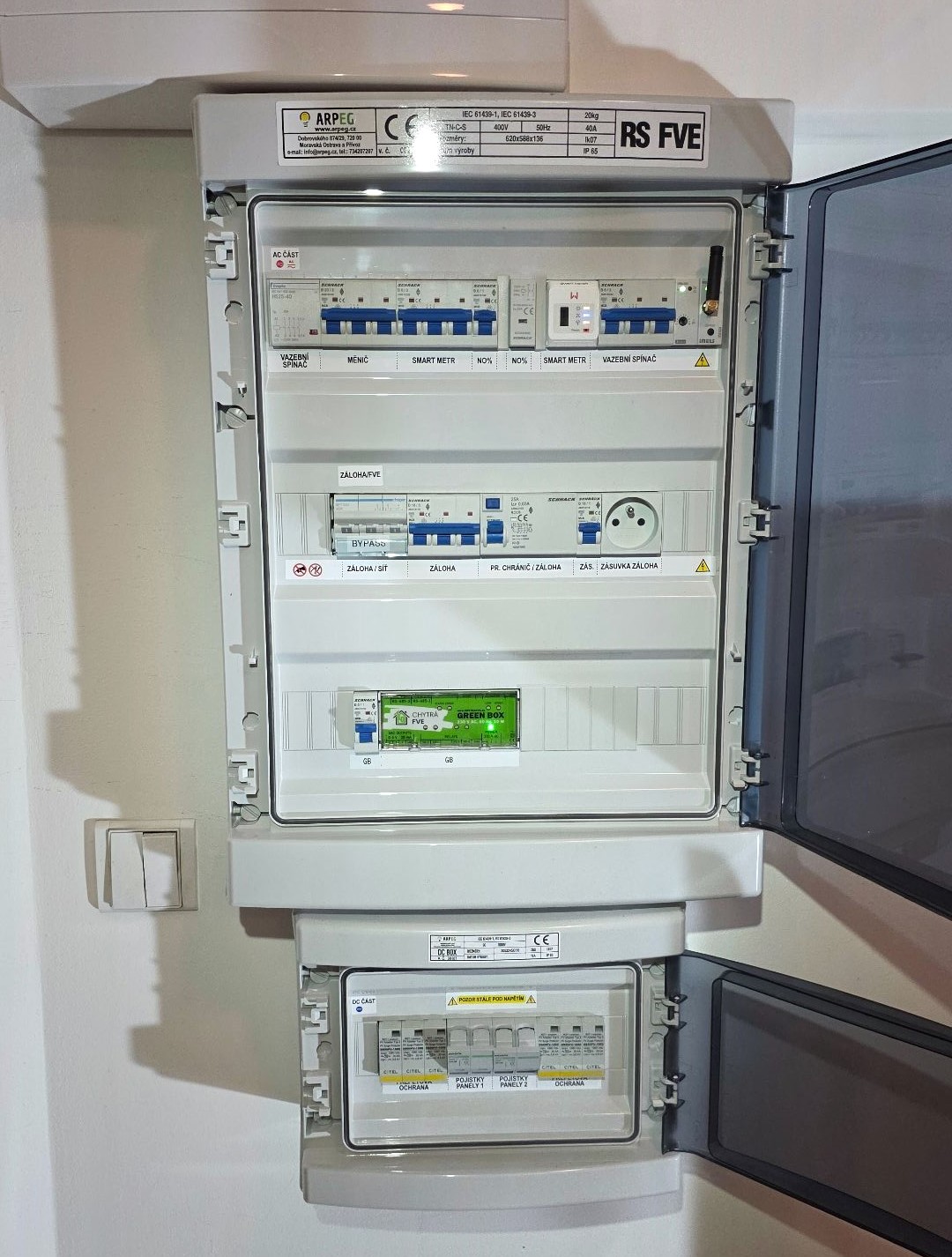 Součástí instalace je GreenBox, inteligentní řídicí jednotka, která zajišťuje chytré a automatizované řízení celé fotovoltaické elektrárny. GreenBox průběžně sleduje výrobu, spotřebu i stav baterií a přizpůsobuje provoz systému aktuálním podmínkám i předpovědi počasí.