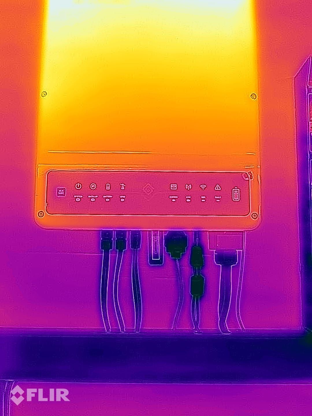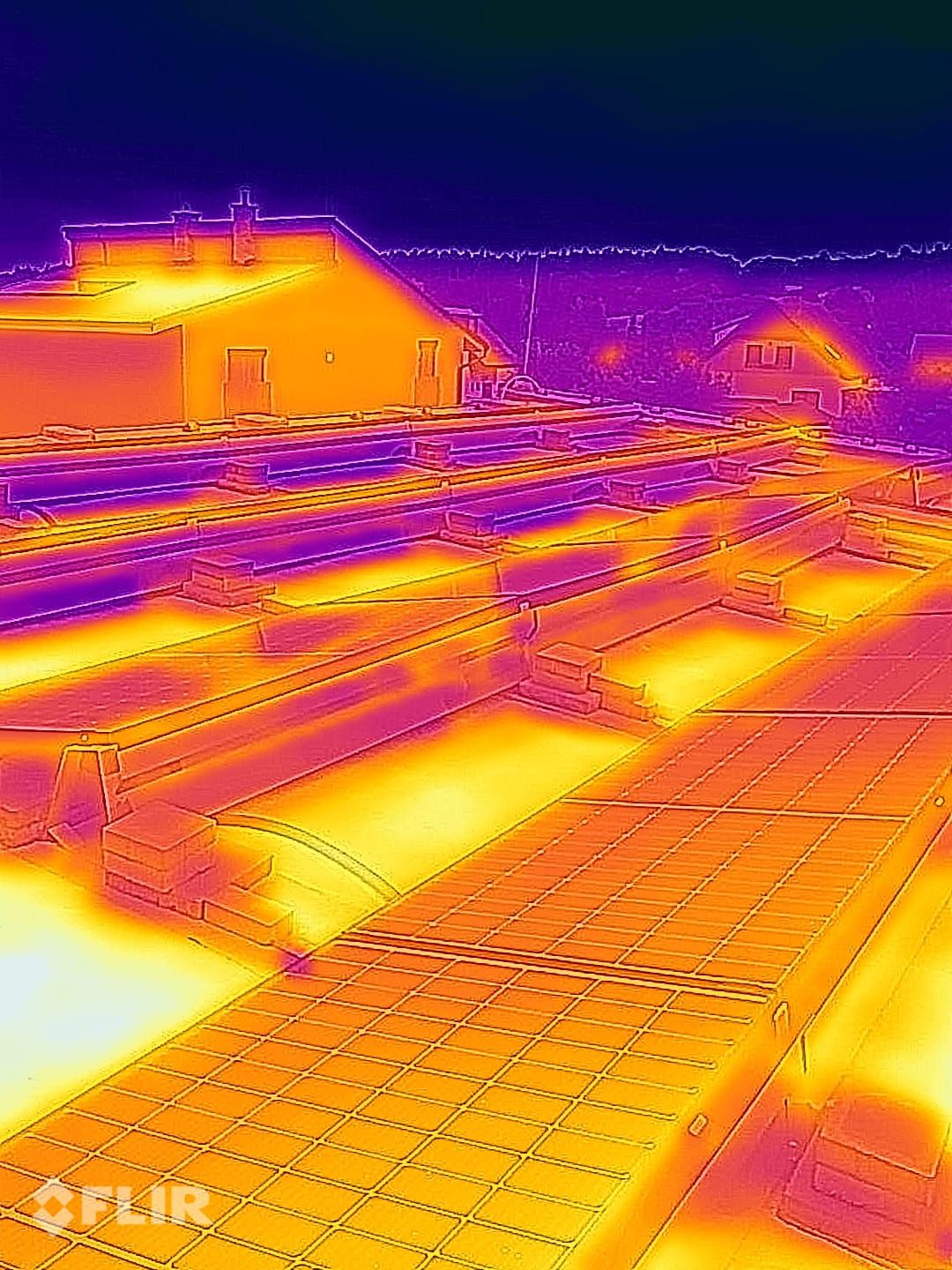 Panely jsme zkontrolovali pomocí termokamery. Teplotní mapy potvrdily rovnoměrné zahřívání bez známek poškození, vadných článků či teplotních anomálií. Konstrukce byla stabilní a správně ukotvená.